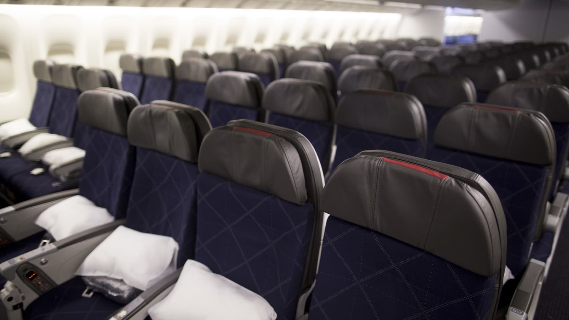 Seats in the economy class cabin aboard an American Airlines Boeing Co. 777-300ER aircraft.