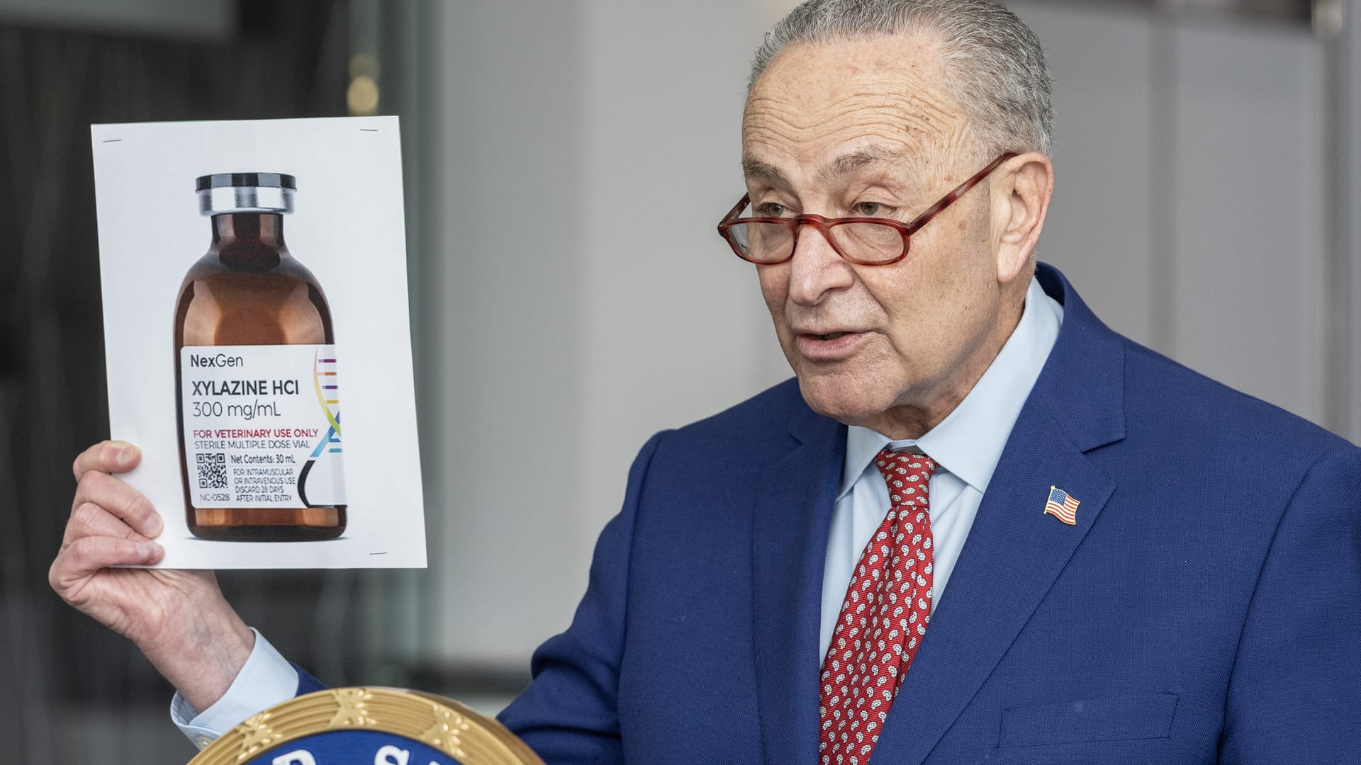 US Senator Charles Schumer speaks while holding a photo of a bottle containing the drug xylazine and mentions a letter from the Drug Enforcement Administration (DEA) warning of the danger of mixing fentanyl with xylazine during of the briefing in the lobby at 875 3rd Avenue in Manhattan on the association of the drug xylazine with overdose deaths.