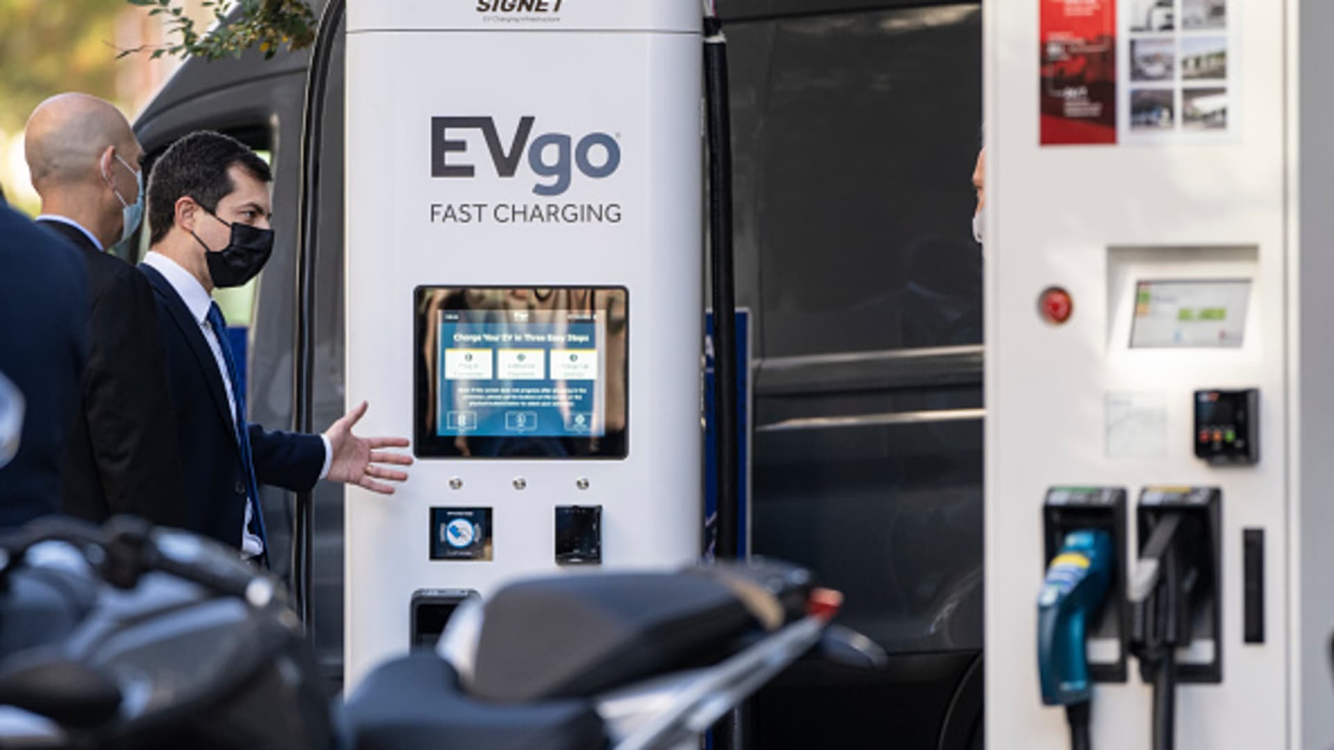 US Secretary of Transportation Pete Buttigieg looks at an EVgo charging station during an electric vehicle event outside the Department of Transportation October 20, 2021 in Washington, DC.