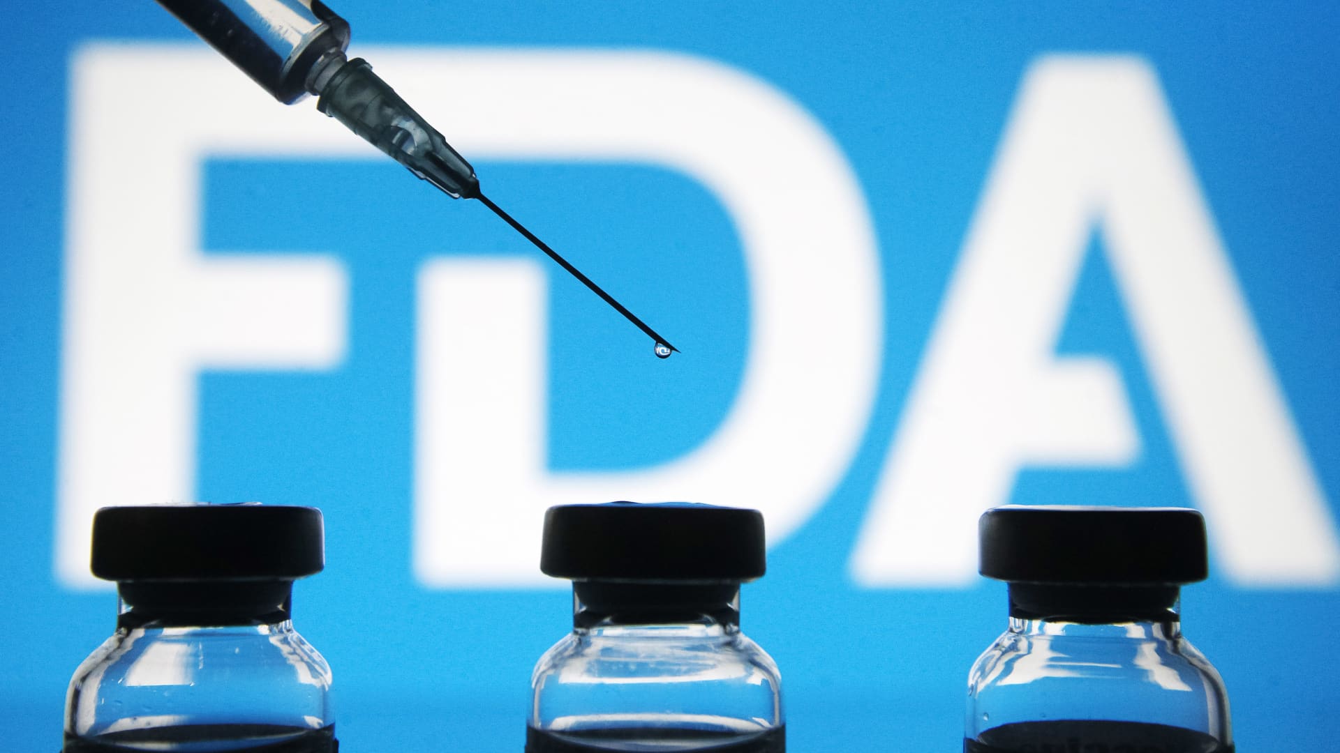 Vials and a medical syringe in front of the United States Food and Drug Administration (FDA) logo. The FDA finds the COVID-19 vaccine.