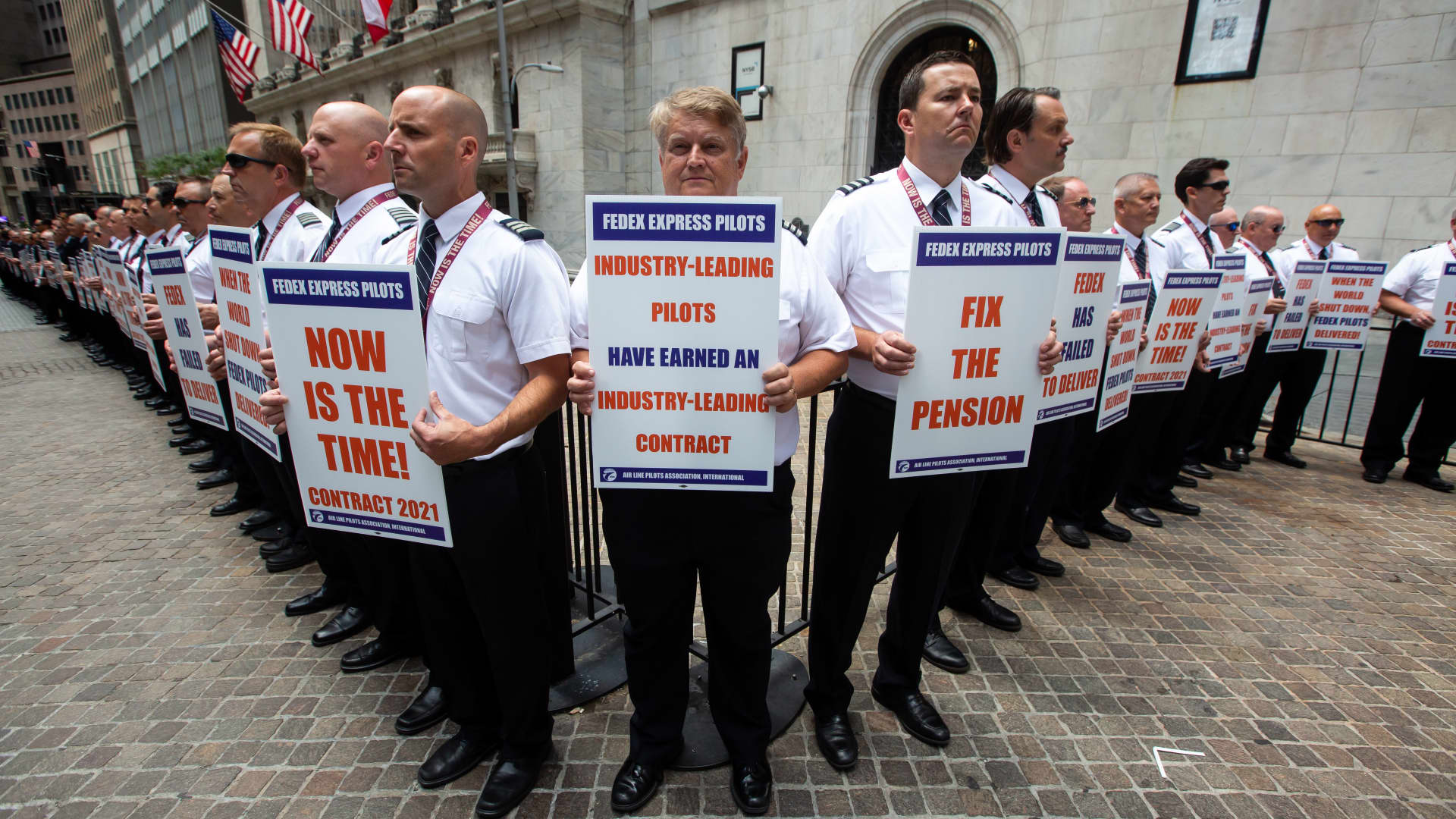 FedEx Express pilots on Monday, September 26, 2022 in front of the New York Stock Exchange (NYSE) in New York.