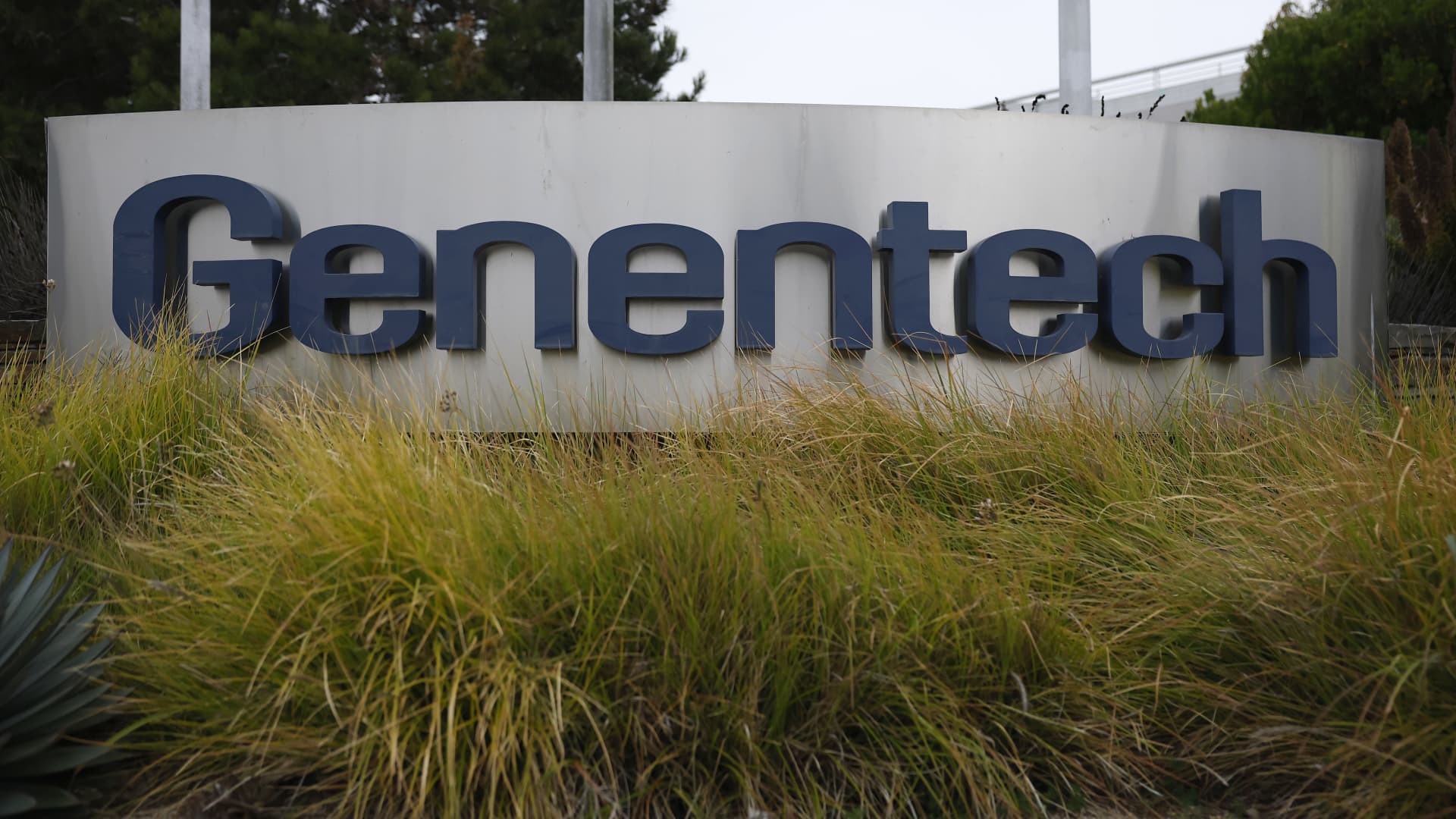 A sign is posted outside a Genentech office in South San Francisco, California, on June 12, 2025.