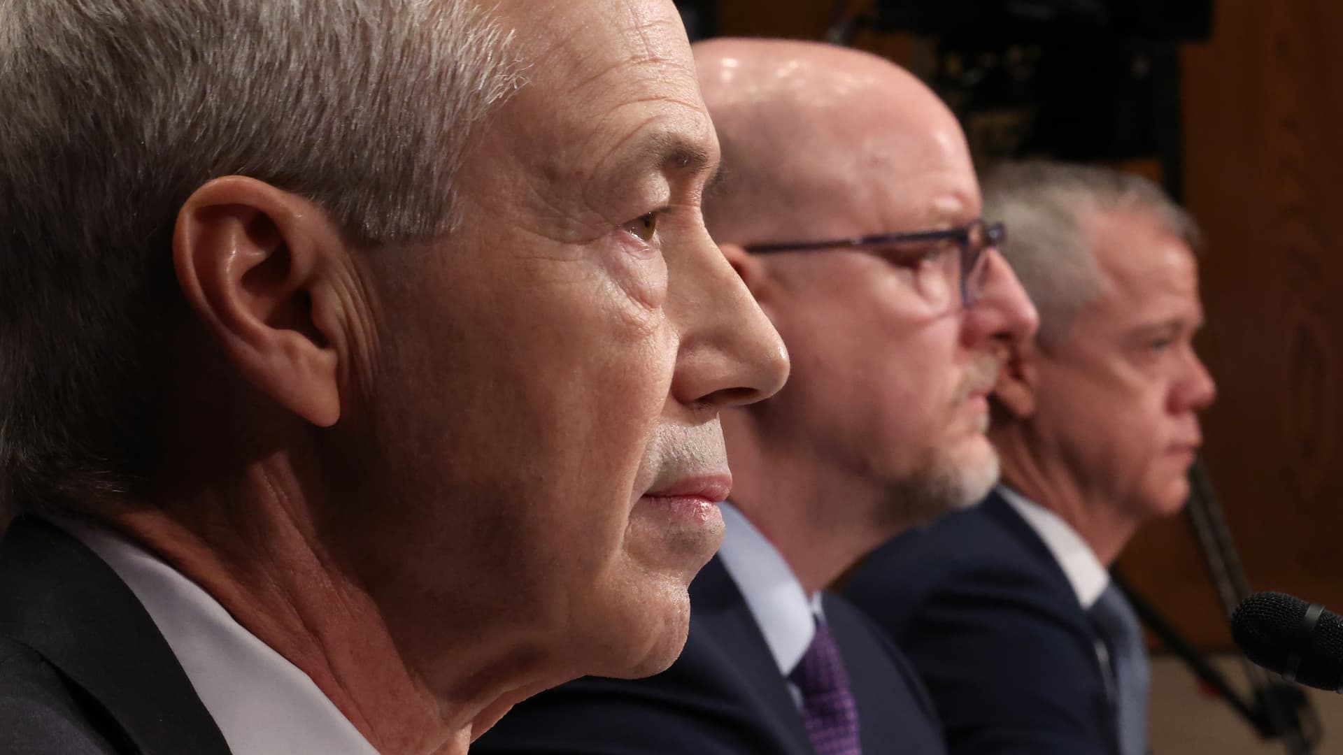 (L-R) Joaquin Duato, CEO of Johnson & Johnson, Robert Davis, CEO of Merck, and Chris Boerner, CEO of Bristol Myers Squibb, testify before the Senate Health, Education, Labor, and Pensions Committee at the Dirksen Senate Office Building on February 08, 2024 in Washington, DC. The Committee held to hearing to investigating the cost of prescription drugs. (Photo by Kevin Dietsch/Getty Images)