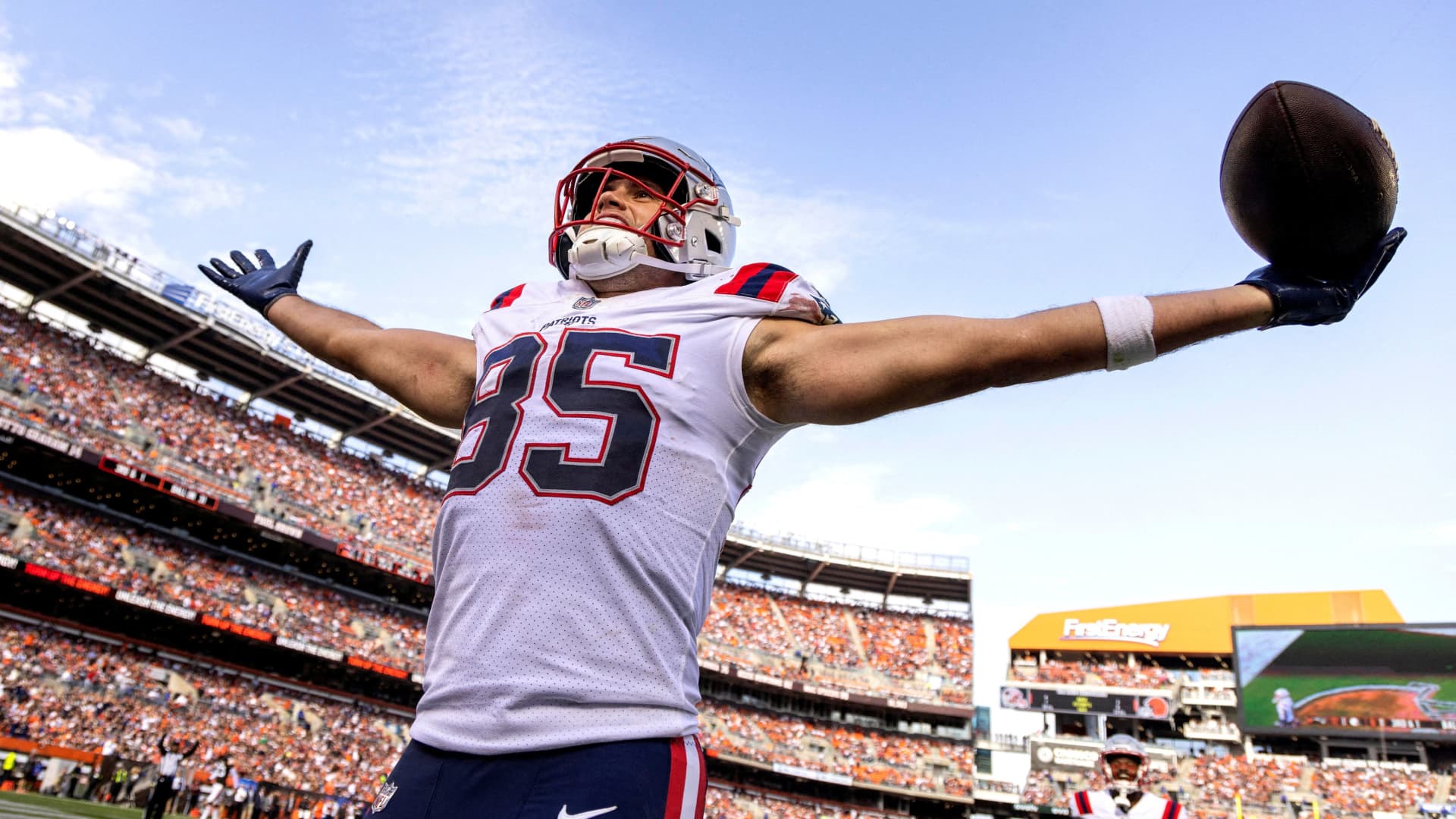 New England Patriots tight end Hunter Henry (85) celebrates his touchdown run against the Cleveland Browns during the third quarter at FirstEnergy Stadium, Oct. 16, 2022.