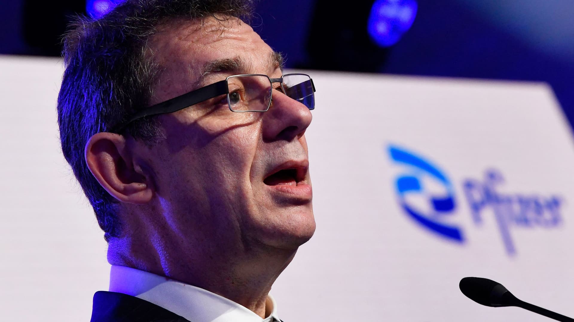 Pfizer CEO Albert Bourla talks during a press conference with the president of the European Commission after a visit to oversee the production of the Pfizer-BioNTech Covid-19 vaccine at the factory of U.S. pharmaceutical company Pfizer, in Puurs, Belgium, April 23, 2021.