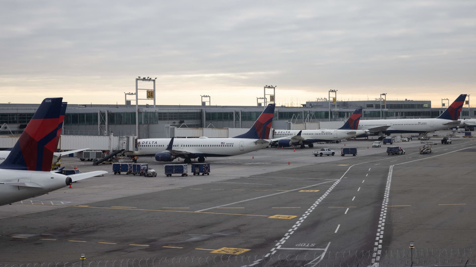 Delta Airlines planes are parked at the gates of John F. Kennedy International Airport on January 11, 2023 in New York.
