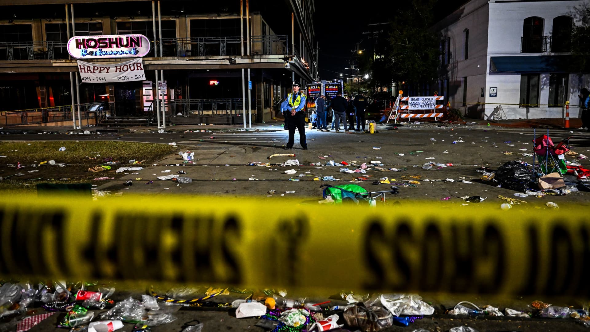 Police officers work at the scene of a shooting that occured during the Krewe of Bacchus parade in New Orleans, February 19, 2023.